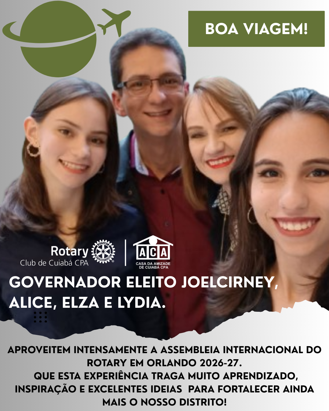 Em breve, Hoje embarcam para Orlando, nos Estados Unidos, para participar da Assembleia Internacional do Rotary 2026-27, um dos mais importantes eventos de formação de lideranças da nossa organização.